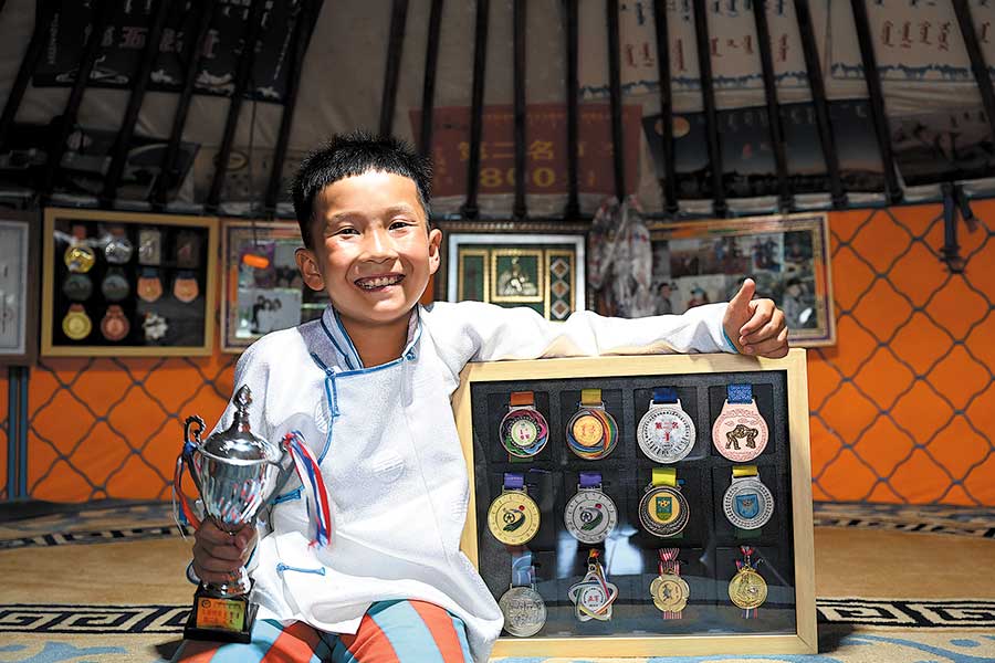 Aztai, de 7 a?os, se toma un descanso durante su entrenamiento para el Festival Naadam en Xiliin, región autónoma de Mongolia Interior, que se extenderá hasta el 15 de septiembre. [Foto/Xinhua]