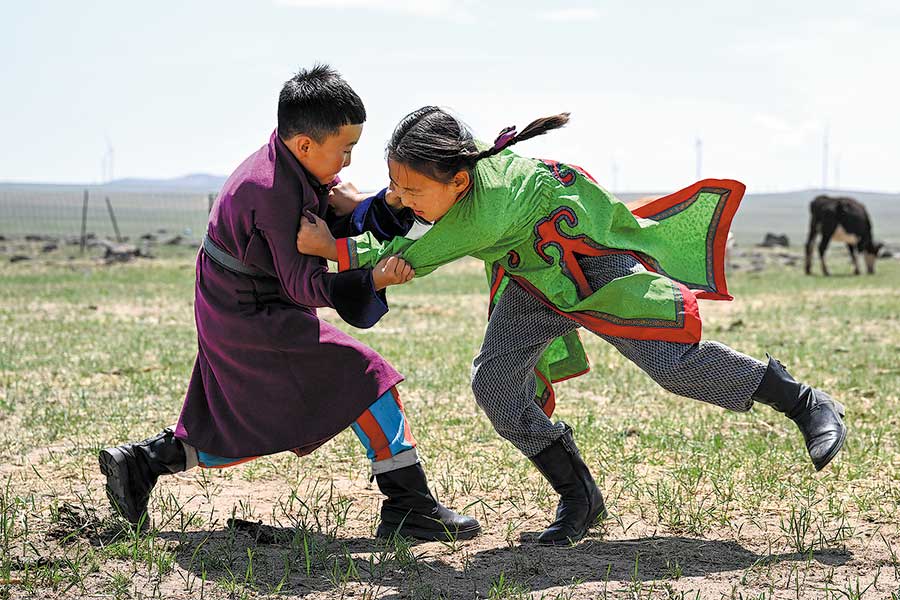 Con la pradera como escenario, Chilmeg (izquierda) lucha con su oponente. [Foto/Xinhua]