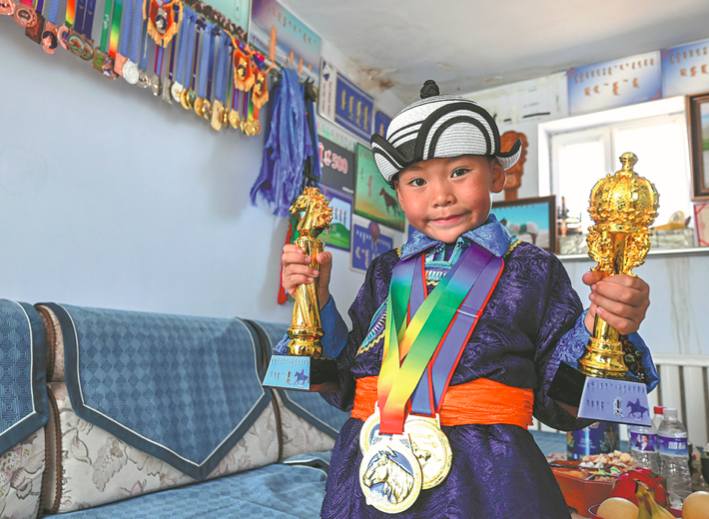 Después de aprender a mantenerse en la silla de montar a la tierna edad de 2 a?os, Aztai, ahora un jinete veterano a los 7 a?os, compitió en las carreras de 8 kilómetros y 12 kilómetros en el Festival Naadam en curso. Su padre, Khas-Ochir, es entrenador de caballos y también de Aztai.