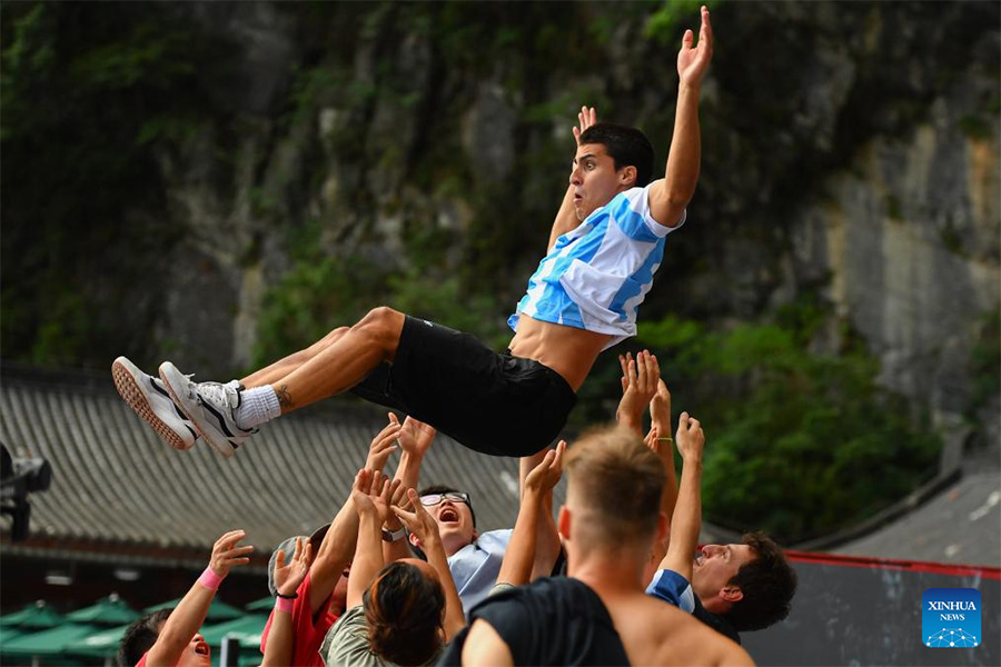 Lautaro Chialvo, de Argentina, festeja después de ganar el Parkour en la Escalera Más Alta 2024 en el Parque Forestal Nacional de la Monta?a de Tianmen, en Zhangjiajie, en la provincia de Hunan, en el centro de China, el 25 de agosto de 2024. (Xinhua/Chen Zeguo)