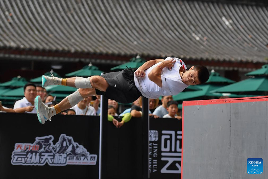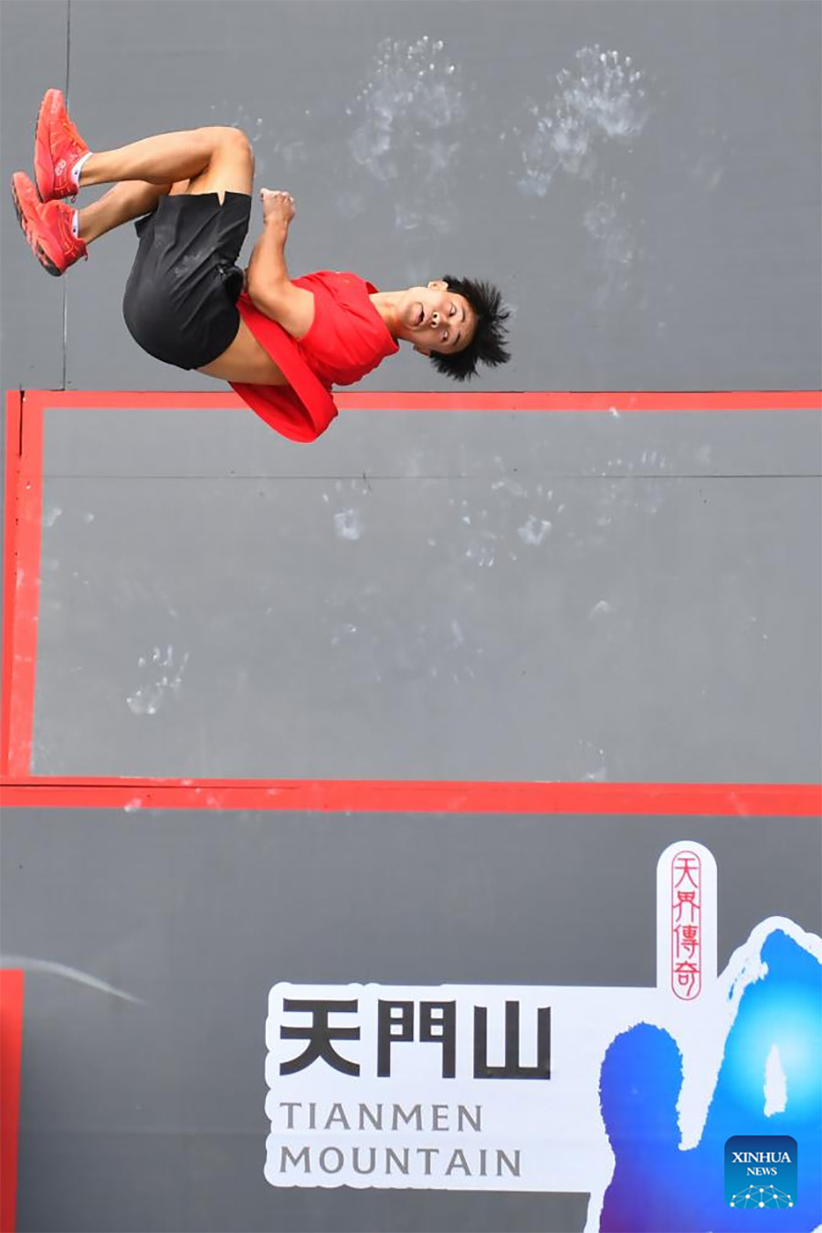 ?Lautaro Chialvo, de Argentina, compite durante el Parkour en la Escalera Más Alta 2024 en el Parque Forestal Nacional de la Monta?a de Tianmen, en Zhangjiajie, en la provincia de Hunan, en el centro de China, el 25 de agosto de 2024. (Xinhua/Chen Zeguo)