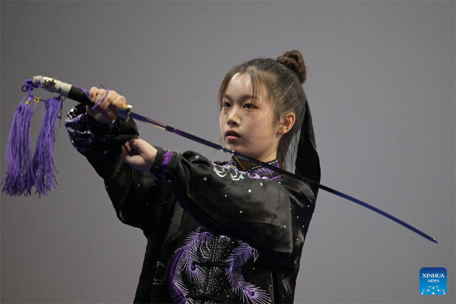 Priscilla Zou, de Estados Unidos, participa durante la competencia de Taijijian Obligatorio (36 Movimientos) de la IWUF femenina del tercer set en el 4o Campeonato Mundial de Taijiquan celebrado en Singapur, el 26 de agosto de 2024. (Xinhua/Then Chih Wey)