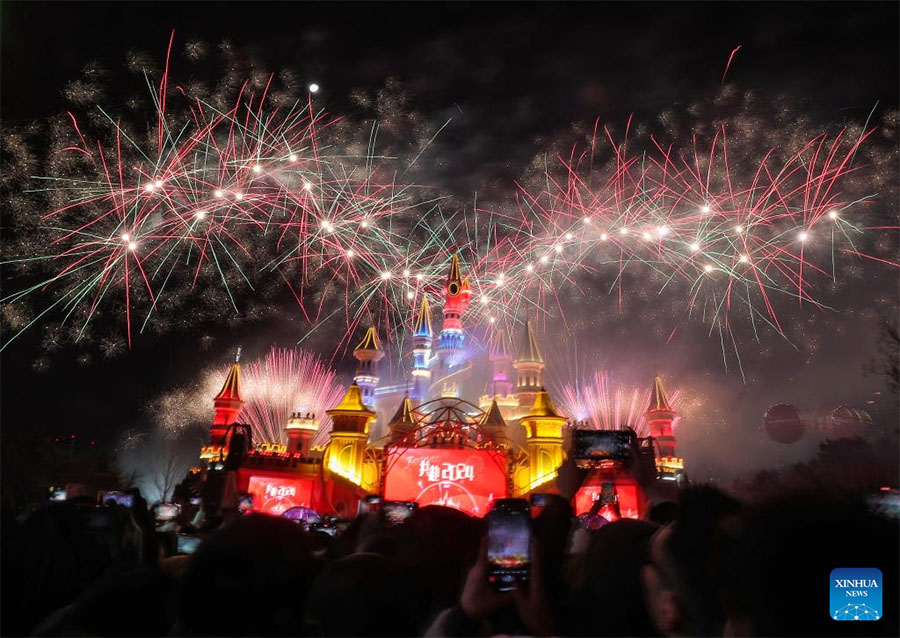 Imagen del 1 de enero de 2024 de fuegos artificiales sobre Fantawild Adventure, en Shenyang, en la provincia de Liaoning, en el noreste de China. En los últimos a?os, la pujante economía nocturna en la región noreste de China ofrece a los habitantes locales y a los turistas opciones de vida nocturna coloridas, lo que ha impulsado el crecimiento de la economía local. (Xinhua/Long Lei)