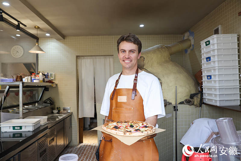 Adrien Brill muestra una pizza cubierta con un pez mandarín maloliente, una delicia local de Huangshan, provincia de Anhui, al este de China. (Diario del Pueblo digital/Zhang Jun)