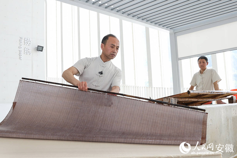 Zhou Donghong fabrica papel Xuan. (Diario del Pueblo digital/Zhang Jun)
