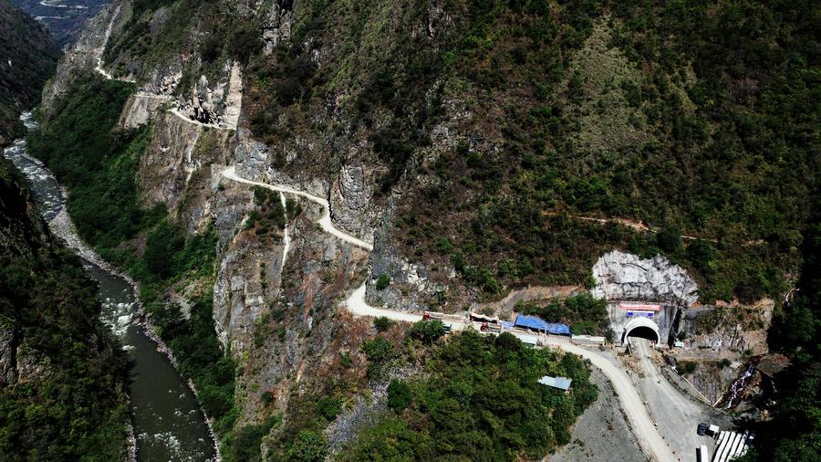 Una vista aérea de la entrada del proyecto del túnel de la carretera hacia Machu Picchu, en la región de Cusco, en Perú, el 23 de junio de 2024.(Xinhua/Li Muzi)