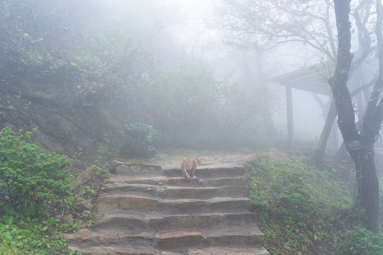 Fotografía tomada el 22 de octubre de 2024 muestra a un gato paseando por el área escénica de la monta?a Yuntai de Haishang, en Lianyungang, provincia de Jiangsu, este de China. (Diario del Pueblo digital/Chang Sha)