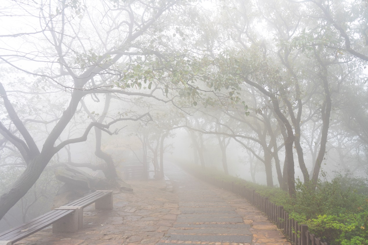 Foto tomada el 22 de octubre de 2024 muestra un sendero en medio de una densa niebla en el área escénica de la monta?a Yuntai de Haishang, en Lianyungang, provincia de Jiangsu, este de China. (Diario del Pueblo digital/Chang Sha)