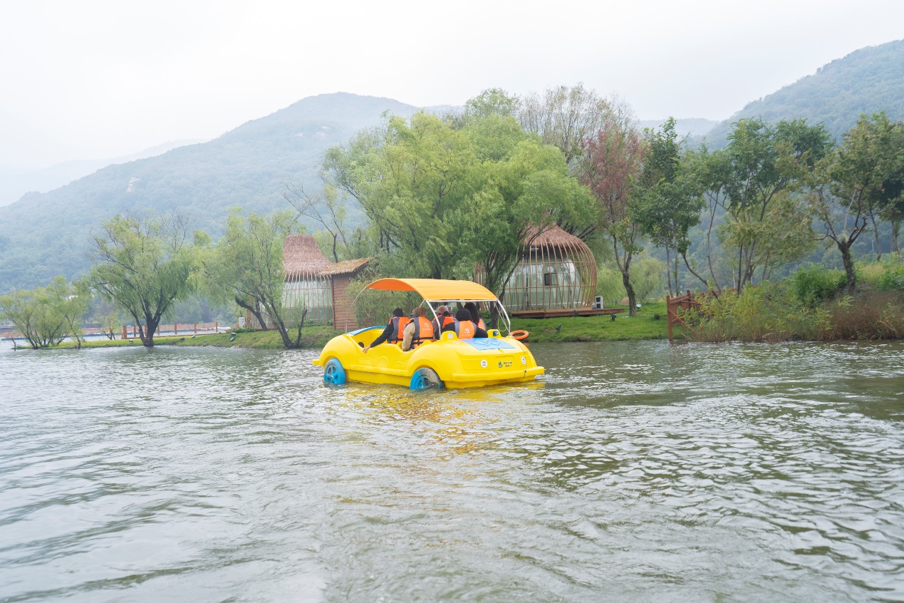 Periodistas extranjeros navegan en un lago en el área escénica de la monta?a Yuntai de Haishang, en Lianyungang, provincia oriental china de Jiangsu, el 22 de octubre de 2024. (Diario del Pueblo digital/Chang Sha)