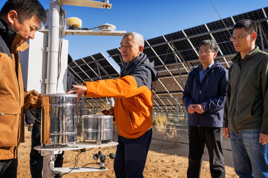 Lu (centro) brinda orientación en la base fotovoltaica del centro experimental de silvicultura del desierto de la Academia China de Ciencias Forestales. [Foto de Justin Jin (del PNUMA)/Para chinadaily.com.cn]