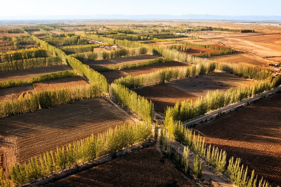 La red agroforestal ubicada dentro del centro experimental de silvicultura del desierto de la Academia China de Ciencias Forestales en el desierto de Ulan Buh. [Fotografía de Justin Jin (del PNUMA)/Para chinadaily.com.cn]