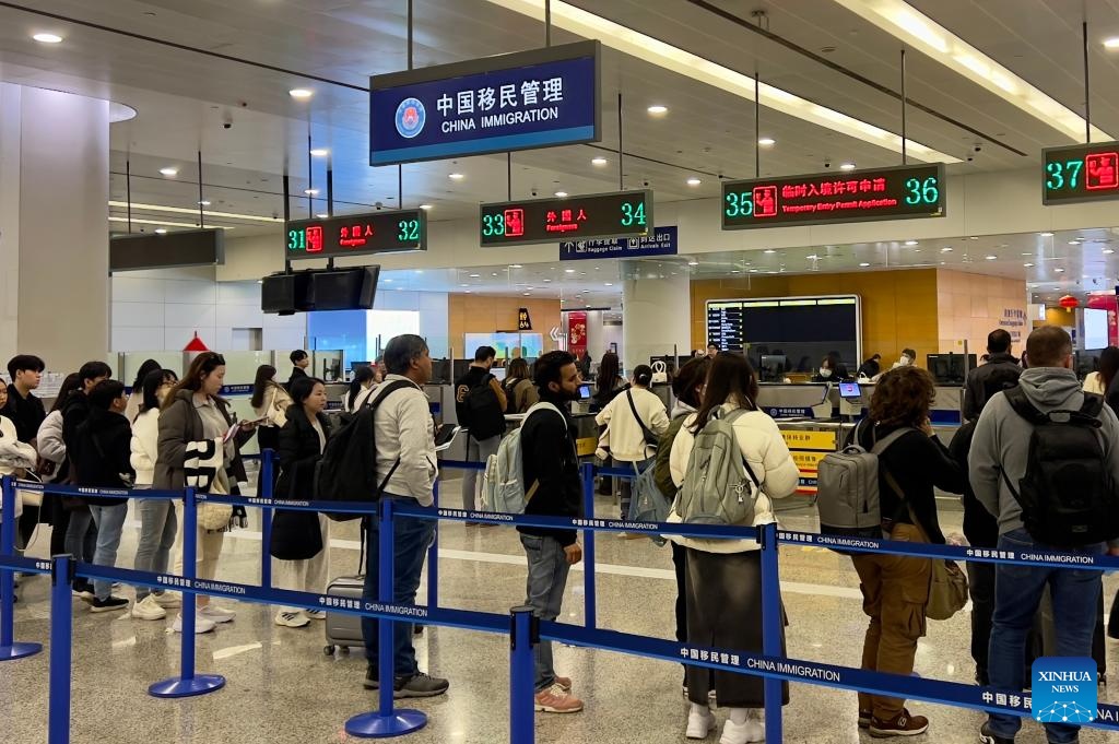Turistas extranjeros esperan para una inspección de ingreso en el Aeropuerto Internacional Pudong de Shanghai, en Shanghai, en el este de China, el 26 de enero de 2025. A medida que China continúa relajando sus políticas sin visa, el país ha visto un aumento notable de visitantes extranjeros que se unen a la temporada alta de viajes de la Fiesta de la Primavera, ansiosos por experimentar sus ricas tradiciones culturales. (Xinhua/Huang Bo)
