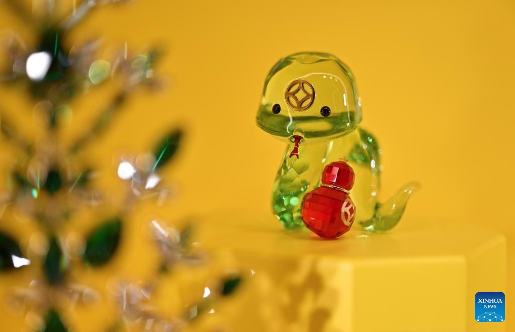 Imagen del 31 de diciembre de 2024 de un adorno con temática de serpiente en el Complejo Comercial Internacional Libre de Impuestos de Haikou, en Haikou, en la provincia de Hainan, en el sur de China. Los compradores acuden en masa a la provincia insular atraídos por los productos temáticos del A?o Nuevo chino de las principales marcas internacionales, uno de los principales atractivos de la temporada de la Fiesta de la Primavera de este a?o. Este a?o será el A?o de la Serpiente. (Xinhua/Guo Cheng)