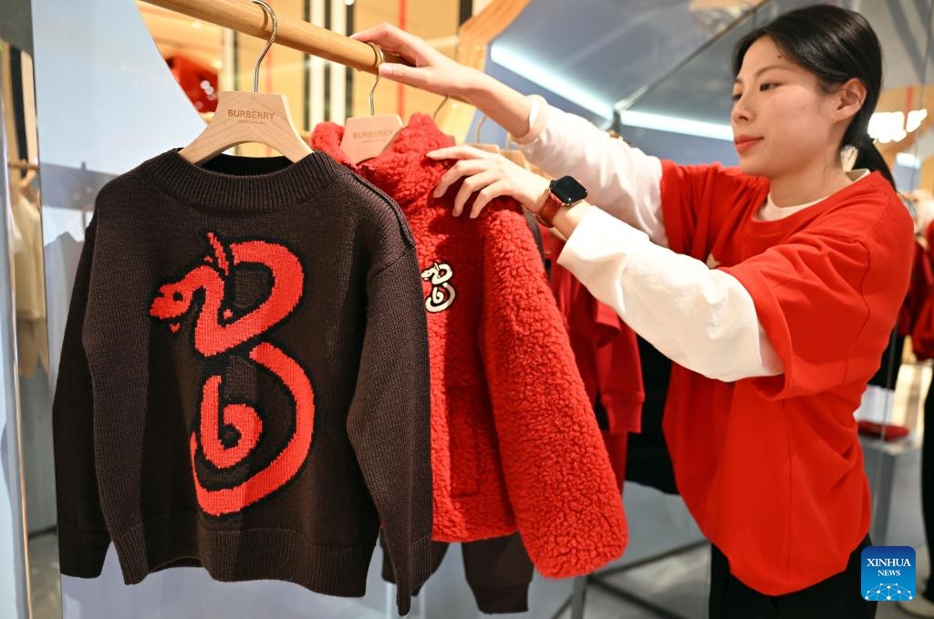 Imagen del 31 de diciembre de 2024 de una vendedora arreglando ropa con temática de serpientes en el Complejo Comercial Internacional Libre de Impuestos de Haikou, en Haikou, en la provincia de Hainan, en el sur de China. Los compradores acuden en masa a la provincia insular atraídos por los productos temáticos del A?o Nuevo chino de las principales marcas internacionales, uno de los principales atractivos de la temporada de la Fiesta de la Primavera de este a?o. Este a?o será el A?o de la Serpiente. (Xinhua/Guo Cheng)