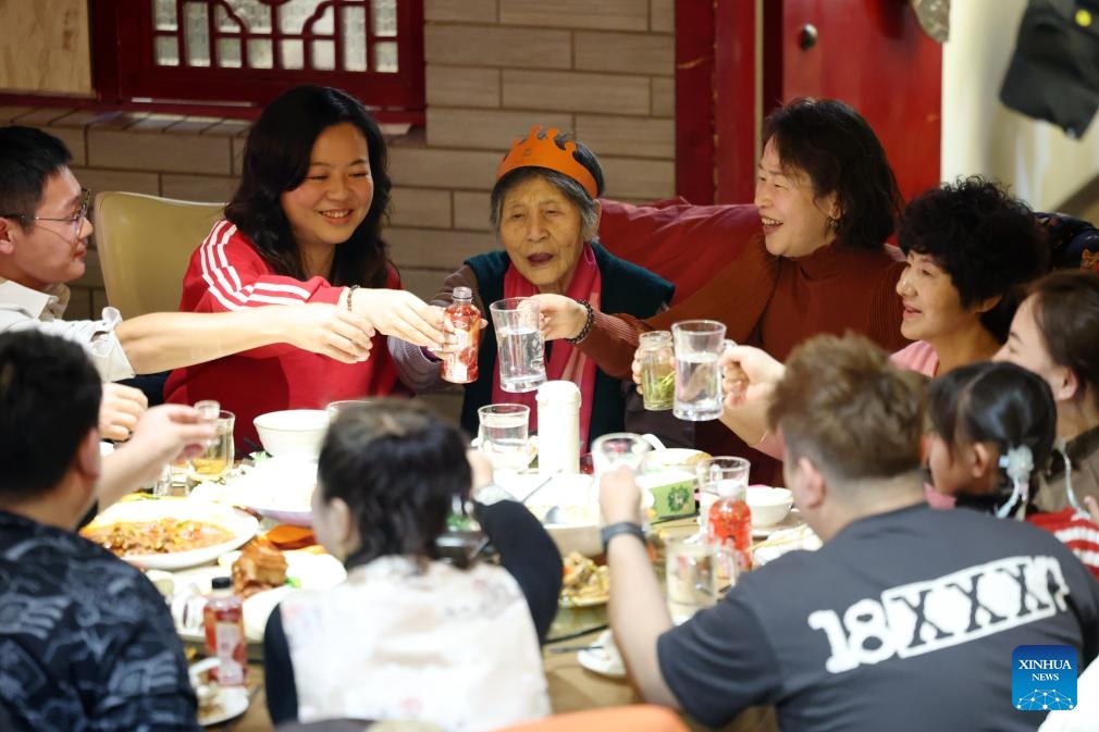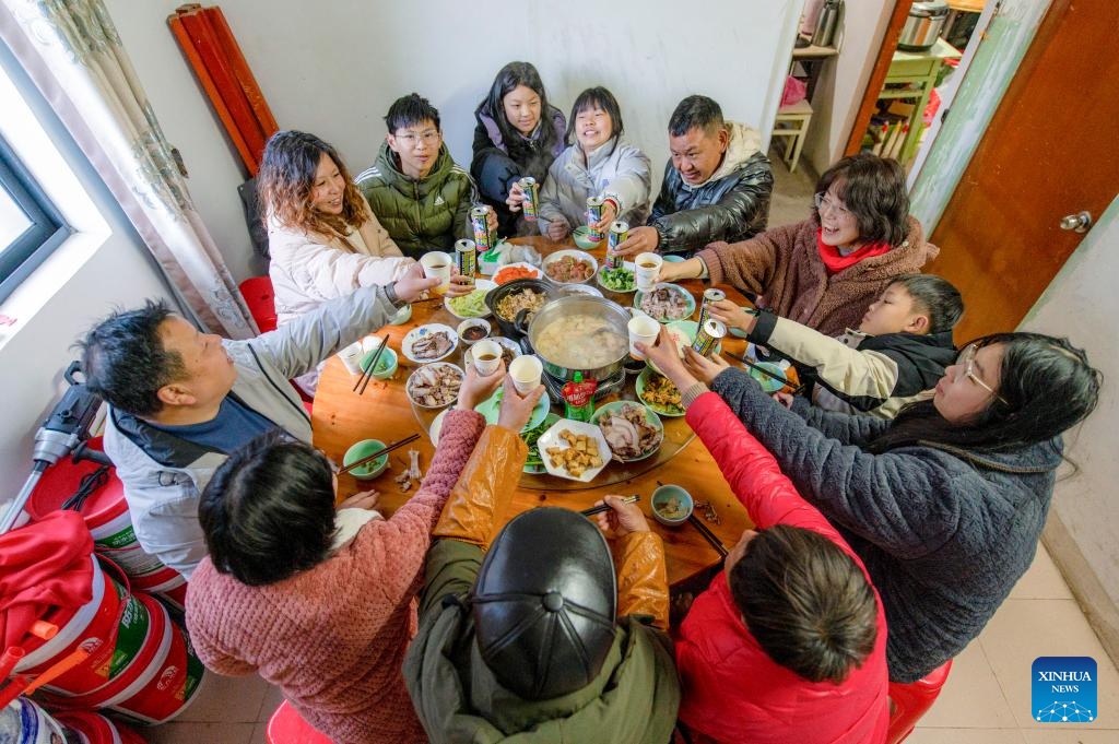 El aldeano Chen Fangjin disfruta de una comida de reunión con sus familiares, en la aldea de Shanhouhu de la ciudad de Jinhua, en la provincia de Zhejiang, en el este de China, el 28 de enero de 2025. Cenar con los miembros de la familia en una comida de reunión ha sido una tradición apreciada para los chinos la víspera de la Fiesta de la Primavera, que cae el 29 de enero este a?o. (Xinhua/Hu Xiaofei)