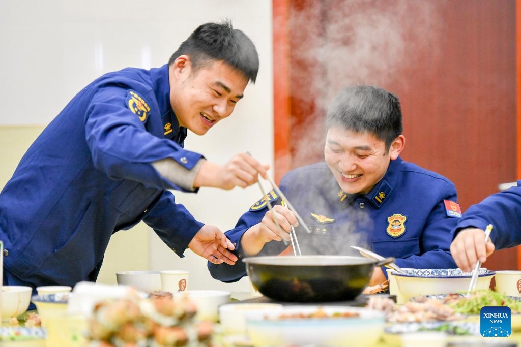 Bomberos participan en una comida en una estación de bomberos, en la ciudad de Taizhou, en la provincia de Jiangsu, en el este de China, el 28 de enero de 2025. Cenar con los miembros de la familia en una comida de reunión ha sido una tradición apreciada para los chinos la víspera de la Fiesta de la Primavera, que cae el 29 de enero este a?o. (Xinhua/Yang Yugang)