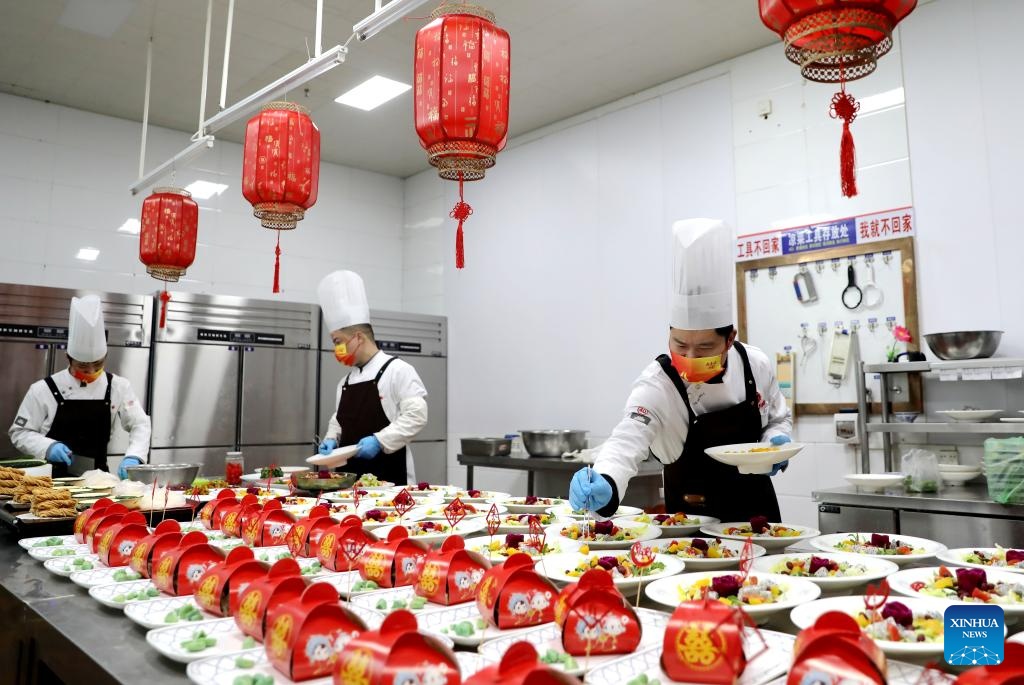Chefs preparan comidas de reunión en un restaurante, en la ciudad de Jiyuan, en la provincia de Henan, en el centro de China, el 28 de enero de 2025. Cenar con los miembros de la familia en una comida de reunión ha sido una tradición apreciada para los chinos la víspera de la Fiesta de la Primavera, que cae el 29 de enero este a?o. (Xinhua/Duan Erping)
