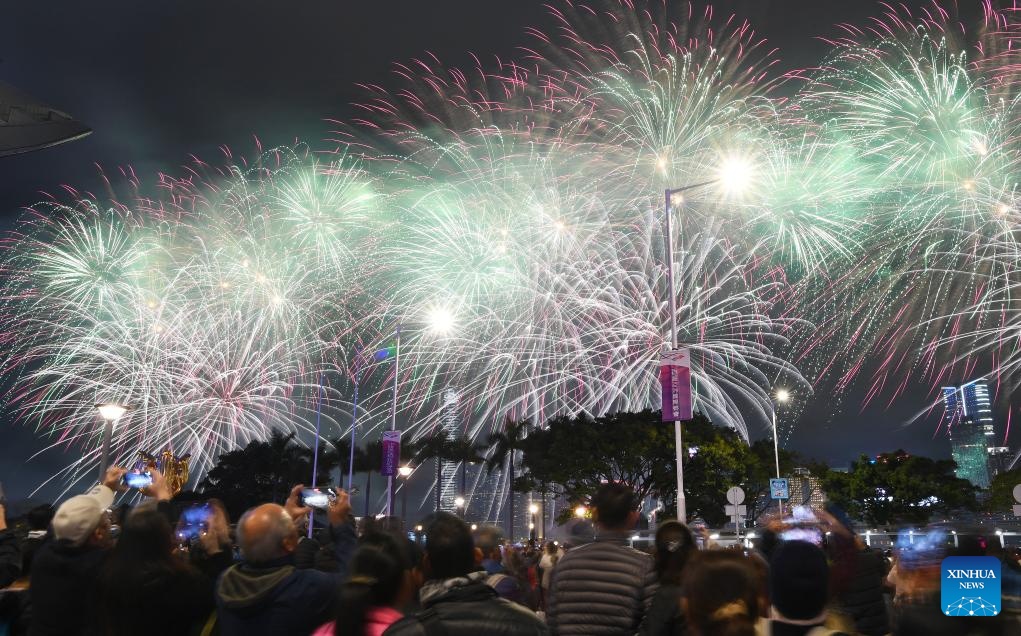 Fuegos artificiales iluminan el cielo sobre el puerto Victoria en celebración de la Fiesta de la Primavera, en Hong Kong, en el sur de China, el 30 de enero de 2025. (Xinhua/Chen Duo)