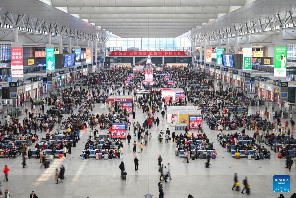 Pasajeros son vistos en la sala de espera de la Estación de Ferrocarril Hongqiao de Shanghai, en Shanghai, en el este de China. China fue testigo de un aumento de los viajes de pasajeros el martes, ya que las vacaciones de la Fiesta de la Primavera de este a?o están llegando a su fin. (Xinhua/Chen Haoming)