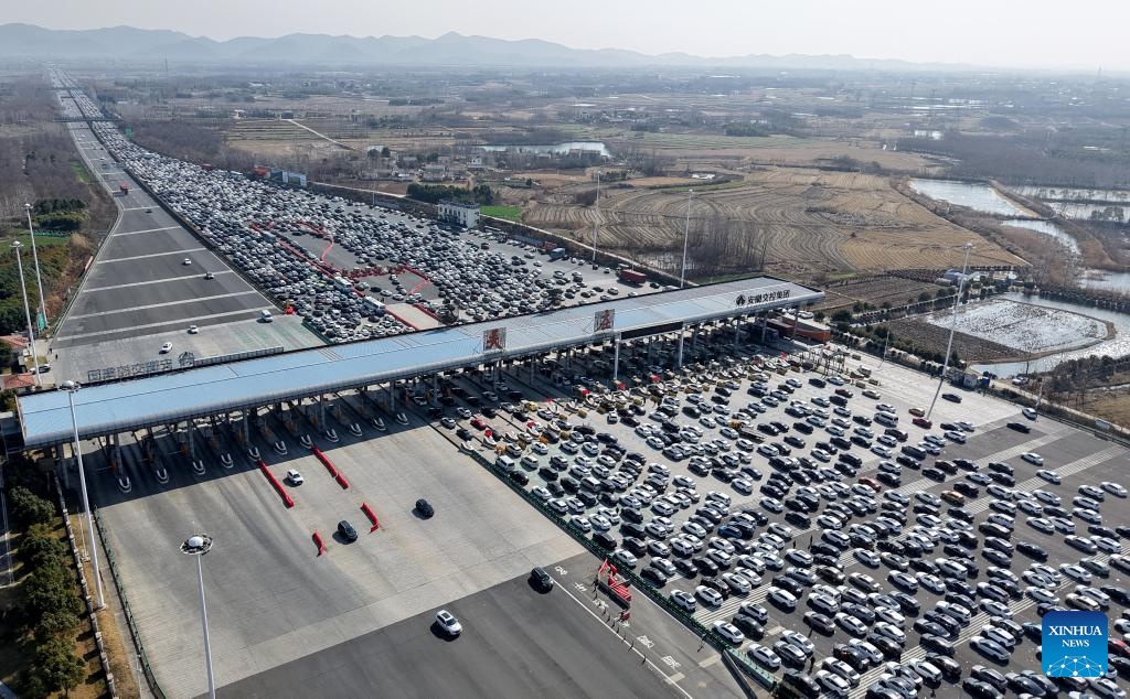 Imagen tomada con un dron el 4 de febrero de 2025 de vehículos en la puerta de un peaje de la autopista Hefei-Nanjing, en el distrito de Quanjiao, en la ciudad de Chuzhou de la provincia de Anhui, en el este de China. China fue testigo de un aumento de los viajes de pasajeros el martes, ya que las vacaciones de la Fiesta de la Primavera de este a?o están llegando a su fin. (Xinhua/Shen Guo)