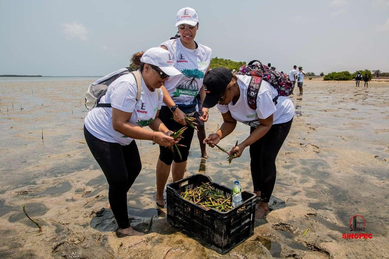 | Empleadas de la filial angole?a de Sinopec International Petroleum Exploration and Production Corporation (SIPC) plantan mangle en una playa. (Foto: Zhao Xuchi) |