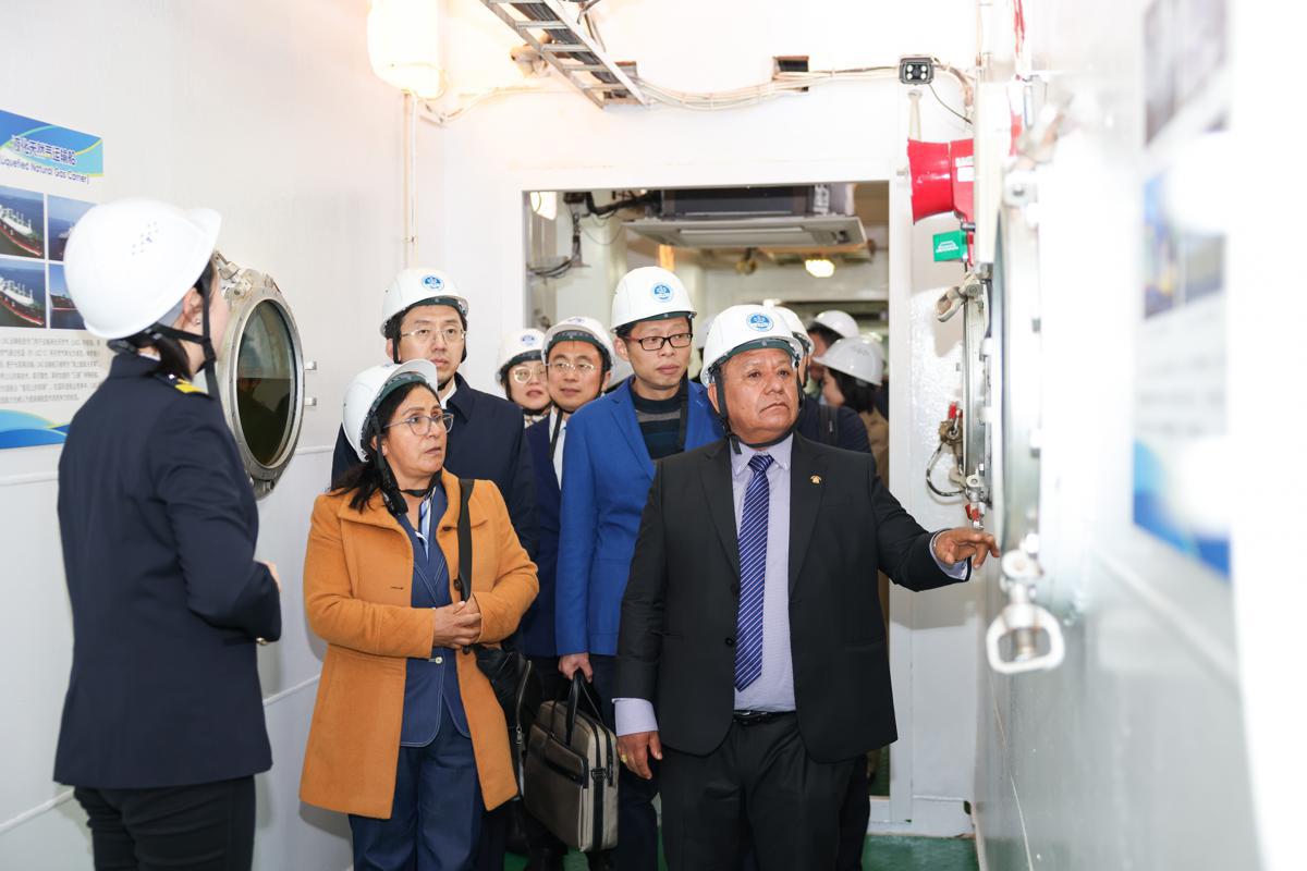 La delegación recorre el Wusong, un buque combinado de carga líquida especial de la Universidad Marítima de Shanghai. [Foto: cedida a China Daily]