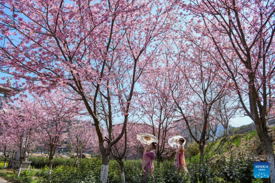 Imagen del 17 de marzo de 2025 de personas con trajes tradicionales disfrutando de los cerezos en flor, en la ciudad de Jinhua, en la provincia de Zhejiang, en el este de China. (Xinhua/Shi Kuanbing)