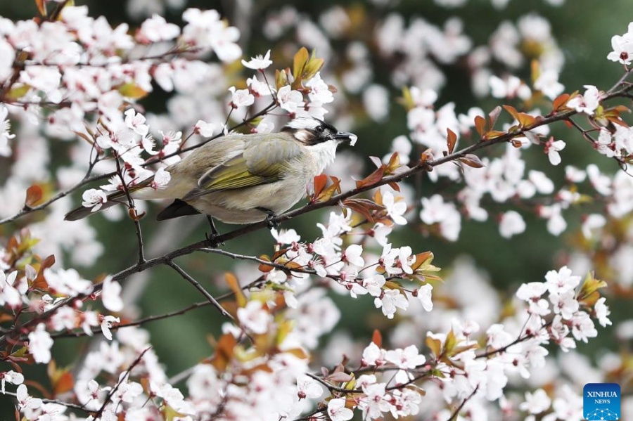Imagen del 16 de marzo de 2025 de un pájaro visto con flores, en la ciudad de Dazhou, en la provincia de Sichuan, en el suroeste de China. (Xinhua/Zeng Meng)