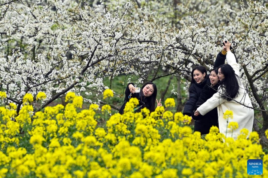 Imagen del 17 de marzo de 2025 de turistas tomándose fotografías con flores, en el distrito de Peng'an de Nanchong, en la provincia de Sichuan, en el suroeste de China. (Xinhua/Liu Yonghong)