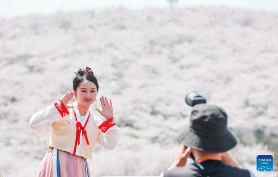 GUIYANG, 26 marzo, 2025 (Xinhua) -- Imagen del 25 de marzo de 2025 de una visitante posando para fotografías en un jardín de cerezos, en la Nueva Area de Gui'an, en la provincia de Guizhou, en el suroeste de China. (Xinhua/Liu Xu)