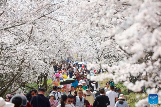 GUIYANG, 26 marzo, 2025 (Xinhua) -- Imagen del 25 de marzo de 2025 de turistas observando los cerezos en flor en un jardín de cerezos, en la Nueva Area de Gui'an, en la provincia de Guizhou, en el suroeste de China. (Xinhua/Liu Xu)