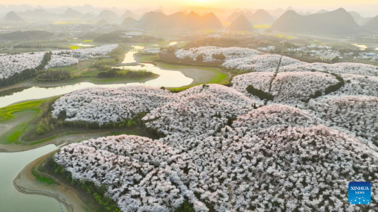 GUIYANG, 26 marzo, 2025 (Xinhua) -- Vista aérea tomada con un dron el 25 de marzo de 2025 de un jardín de cerezos, en la Nueva Area de Gui'an, en la provincia de Guizhou, en el suroeste de China. (Xinhua/Yuan Fuhong)