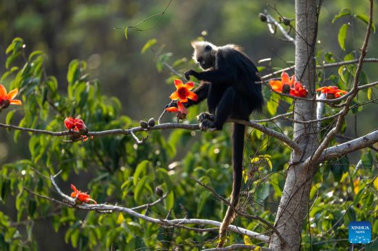 CHONGZUO, 27 marzo, 2025 (Xinhua) -- Imagen del 22 de marzo de 2025 de un langur de cabeza blanca comiendo una flor de algodón de seda en una reserva natural nacional, en el distrito de Jiangzhou, en la ciudad de Chongzuo, en la región autónoma de la etnia zhuang de Guangxi, en el sur de China. Las flores de algodón de seda de la reserva están en plena floración. (Xinhua/Qiu Lingling)