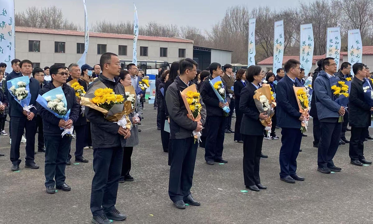 Personas sostienen flores en honor a los donantes de órganos durante una ceremonia conmemorativa celebrada en Shenyang, provincia de Liaoning, noreste de China, el 1 de abril de 2025. Foto: Zhang Wanshi/GT
