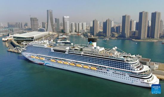 QINGDAO, 6 abril, 2025 (Xinhua) -- El Adora Magic City atraca en la Terminal Internacional de Cruceros de Qingdao, en Qingdao, en la provincia de Shandong, en el este de China, el 6 de abril de 2025. Como el primer gran crucero construido en China, el Adora Magic City se embarcó en su viaje comercial inaugural el 1 de enero de 2024. Esta vez, el crucero hizo su debut en Qingdao, que es su primera aparición en una ciudad portuaria china que no sea su puerto base en Shanghai, y partirá hacia Jeju en República de Corea y Fukuoka en Japón. (Xinhua/Li Ziheng)