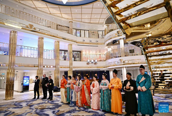 QINGDAO, 6 abril, 2025 (Xinhua) -- Miembros de la tripulación del Adora Magic City reciben a los pasajeros a bordo en la Terminal Internacional de Cruceros de Qingdao, en Qingdao, en la provincia de Shandong, en el este de China, el 6 de abril de 2025. Como el primer gran crucero construido en China, el Adora Magic City se embarcó en su viaje comercial inaugural el 1 de enero de 2024. Esta vez, el crucero hizo su debut en Qingdao, que es su primera aparición en una ciudad portuaria china que no sea su puerto base en Shanghai, y partirá hacia Jeju en República de Corea y Fukuoka en Japón. (Xinhua/Li Ziheng)