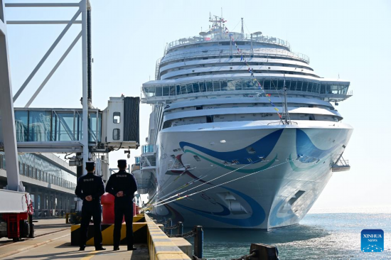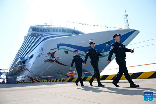 QINGDAO, 6 abril, 2025 (Xinhua) -- Oficiales de inmigración pasan frente al Adora Magic City en la Terminal Internacional de Cruceros de Qingdao, en Qingdao, en la provincia de Shandong, en el este de China, el 6 de abril de 2025. Como el primer gran crucero construido en China, el Adora Magic City se embarcó en su viaje comercial inaugural el 1 de enero de 2024. Esta vez, el crucero hizo su debut en Qingdao, que es su primera aparición en una ciudad portuaria china que no sea su puerto base en Shanghai, y partirá hacia Jeju en República de Corea y Fukuoka en Japón. (Xinhua/Li Ziheng)