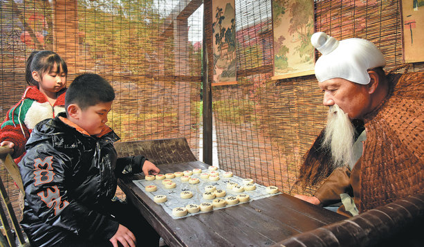 Un Jiang Ziya, interpretado por un trabajador temporal, juega al ajedrez chino con un estudiante visitante en el parque. CHINA DAILY