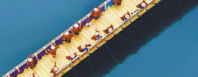Una imagen aérea muestra a los trabajadores pescando desde un puente sobre un lago en el parque. CHINA DAILY