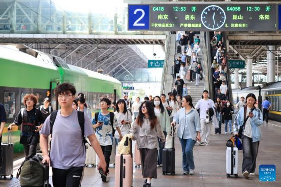 NANJING, 30 abril, 2025 (Xinhua) -- Pasajeros ingresan a la Estación del Ferrocarril de Nanjing, en Nanjing, en la provincia de Jiangsu, en el este de China, el 30 de abril de 2025. Se espera que la red ferroviaria de China maneje aproximadamente 144 millones de viajes de pasajeros durante la temporada alta de viajes de ocho días por el feriado del Primero de Mayo, que comenzó el martes, informó el operador ferroviario nacional. (Xinhua/Su Yang)