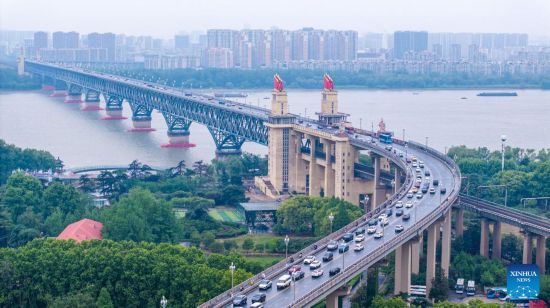 BEIJING, 5 mayo, 2025 (Xinhua) -- Vista aérea tomada con un dron del flujo de tránsito en el puente de Nanjing sobre el río Yangtze, en Nanjing, en la provincia de Jiangsu, en el este de China, el 5 de mayo de 2025. En el último día del feriado del Primero de Mayo, se observó un pico en los viajes de regreso en todo el país. (Xinhua/Yang Suping)