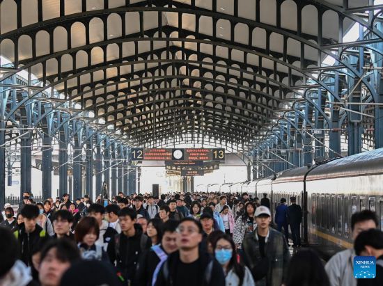 BEIJING, 5 mayo, 2025 (Xinhua) -- Pasajeros desembarcan en la Estación de Ferrocarriles de Harbin, en Harbin, en la provincia de Heilongjiang, en el noreste de China, el 5 de mayo de 2025. En el último día del feriado del Primero de Mayo, se observó un pico en los viajes de regreso en todo el país. (Xinhua/Yuan Yong)