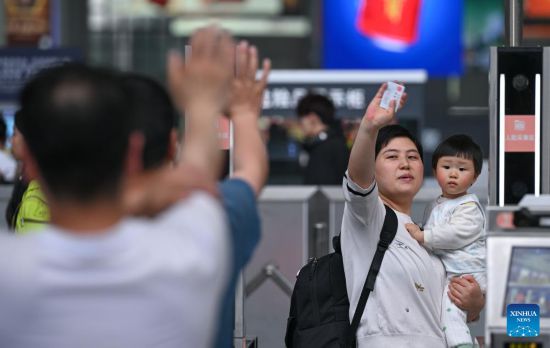BEIJING, 5 mayo, 2025 (Xinhua) -- Pasajeros se despiden de sus amigos y familiares en la Estación de Ferrocarriles del Norte de Chongqing, en Chongqing, en el suroeste de China, el 5 de mayo de 2025. En el último día del feriado del Primero de Mayo, se observó un pico en los viajes de regreso en todo el país. (Xinhua/Chen Cheng)