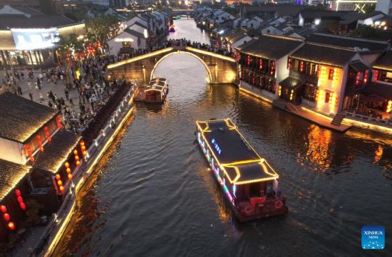 WUXI, 6 mayo, 2025 (Xinhua) -- Vista aérea tomada con un dron el 4 de mayo de 2025 de turistas visitando la comunidad histórica del puente Qingming, en Wuxi, en la provincia de Jiangsu, en el este de China. Los viajeros chinos realizaron 314 millones de viajes internos y gastaron 180.300 millones de yuanes (unos 25.000 millones de dólares) del 1 al 5 de mayo, lo que representa incrementos interanuales del 6,4 por ciento y 8 por ciento respectivamente, de acuerdo con cifras oficiales. (Xinhua/Huan Yueliang)