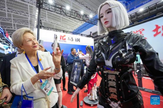 HARBIN, 17 mayo, 2025 (Xinhua) -- Una robot humanoide es vista en la 34 Feria Internacional de Economía y Comercio de Harbin, en Harbin, capital de la provincia de Heilongjiang, en el noreste de China, el 17 de mayo de 2025. La feria se inauguró aquí el sábado, atrayendo a expositores de más de 110 países y regiones. (Xinhua/Wang Jianwei)