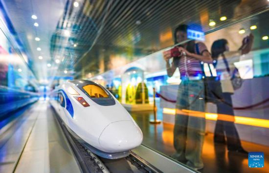 KUNMING, 17 mayo, 2025 (Xinhua) -- Imagen del 16 de mayo de 2025 de una visitante tomando fotografías de un modelo de tren bala Fuxing en el Museo del Ferrocarril de Yunnan, en Kunming, en la provincia de Yunnan, en el suroeste de China. Ubicado en la Estación del Ferrocarril Norte de Kunming, el Museo del Ferrocarril de Yunnan toma la historia centenaria del desarrollo del ferrocarril de Yunnan como la historia principal para narrar la vertiginosa evolución de los estándares de ancho de vía, desde el ancho de vía métrico hasta el ancho de vía en pulgadas y el ancho de vía estándar, así como las tecnologías ferroviarias desde las locomotoras de vapor hasta los ferrocarriles de alta velocidad. (Xinhua/Chen Xinbo)
