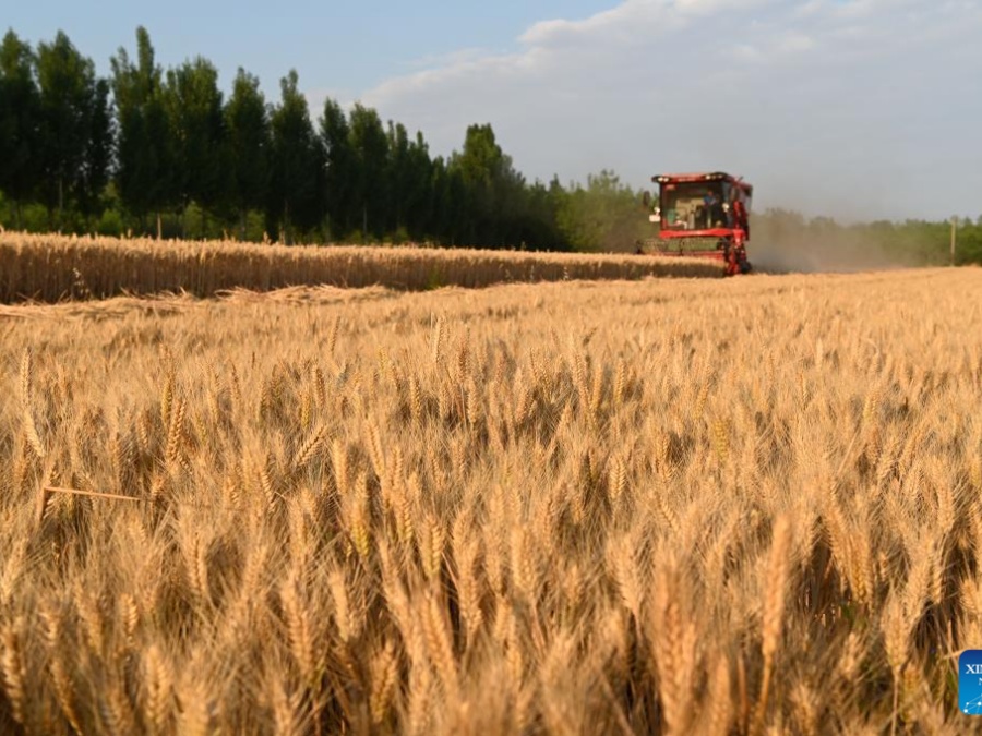 Una segadora cosecha trigo en los campos, en la aldea de Huzi de Qinyang, en la provincia de Henan, en el centro de China, el 25 de mayo de 2025. El trigo de invierno se cosecha sucesivamente en todo el país, según el Ministerio de Agricultura y Asuntos Rurales. (Xinhua/Yang Fan)